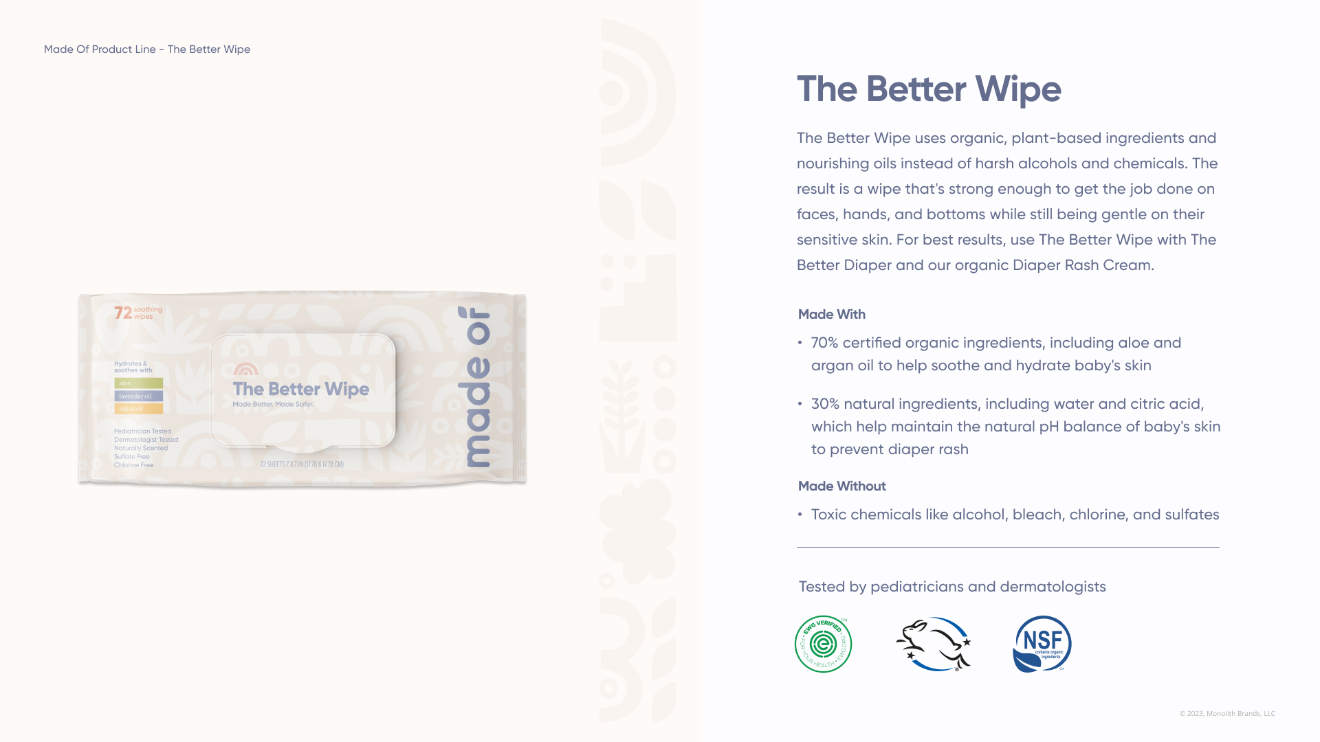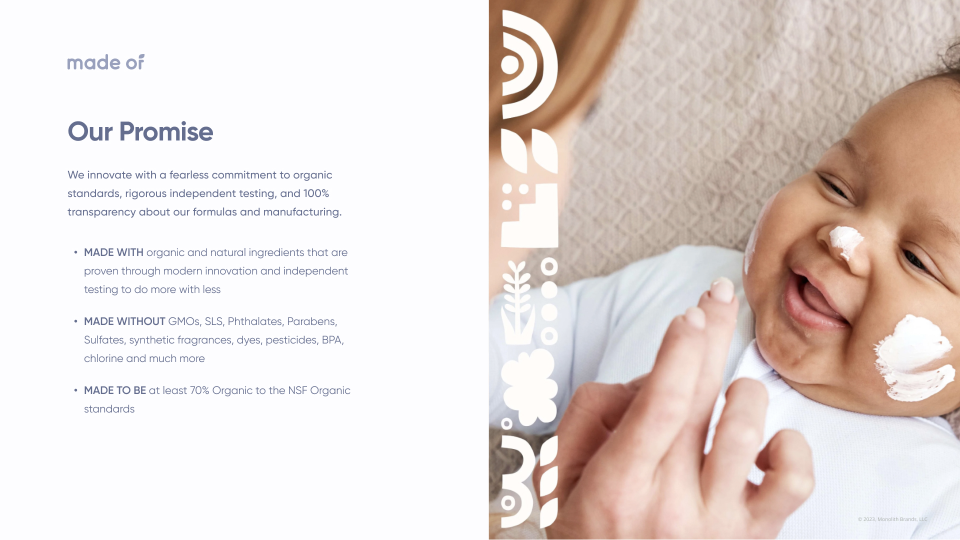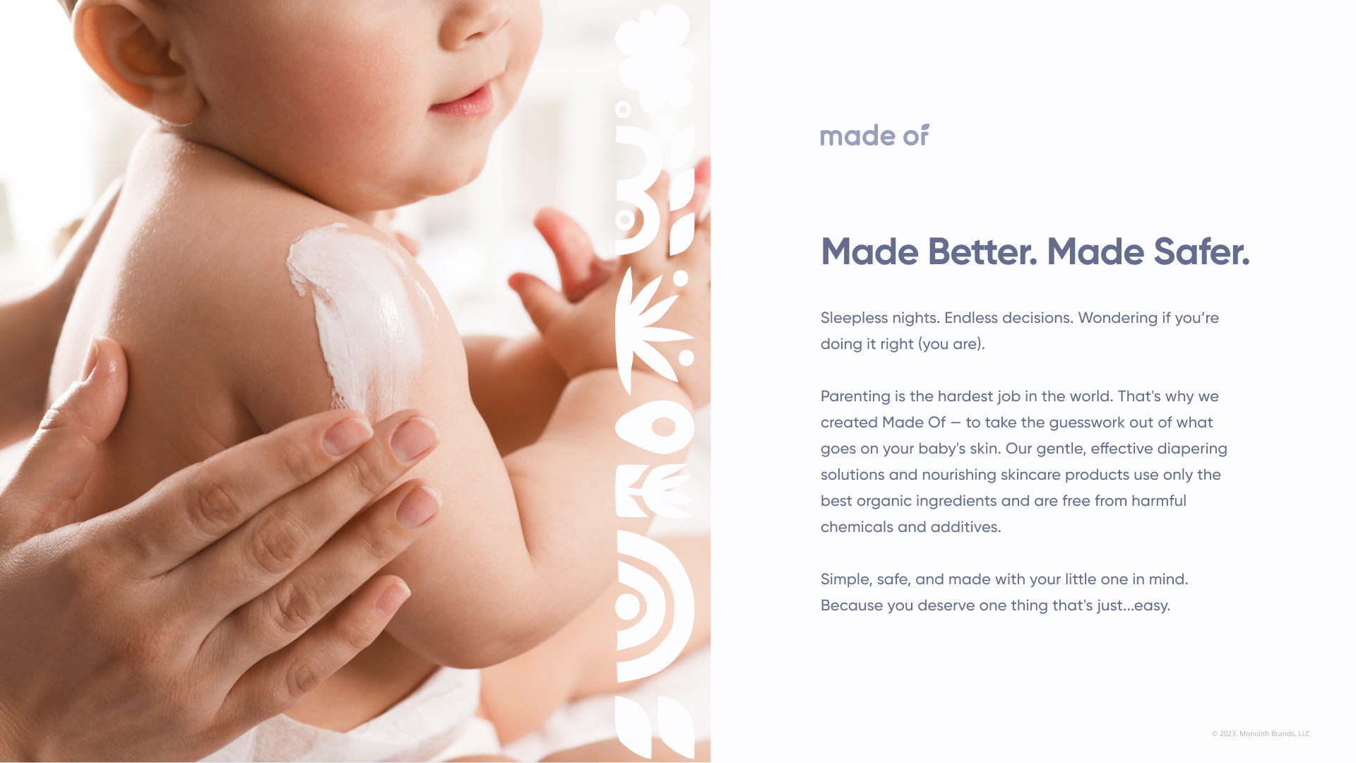 Made Of had something special: a genuine commitment to clean, organic ingredients and real transparency with the parents who trusted them. But the brand’s clinical tone and loud visual style told a story that was at odds with that quiet, honest ethos. There was a disconnect between what the brand truly stood for and how it was showing up in the world. We came in to close that gap, reimagining the brand voice and visual identity from the ground up. The result is a brand that finally sounds and looks like itself—warm, honest, and always centered on the well-being of little ones and the parents who love them fiercely.