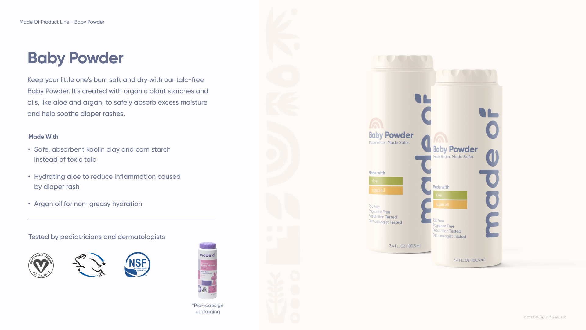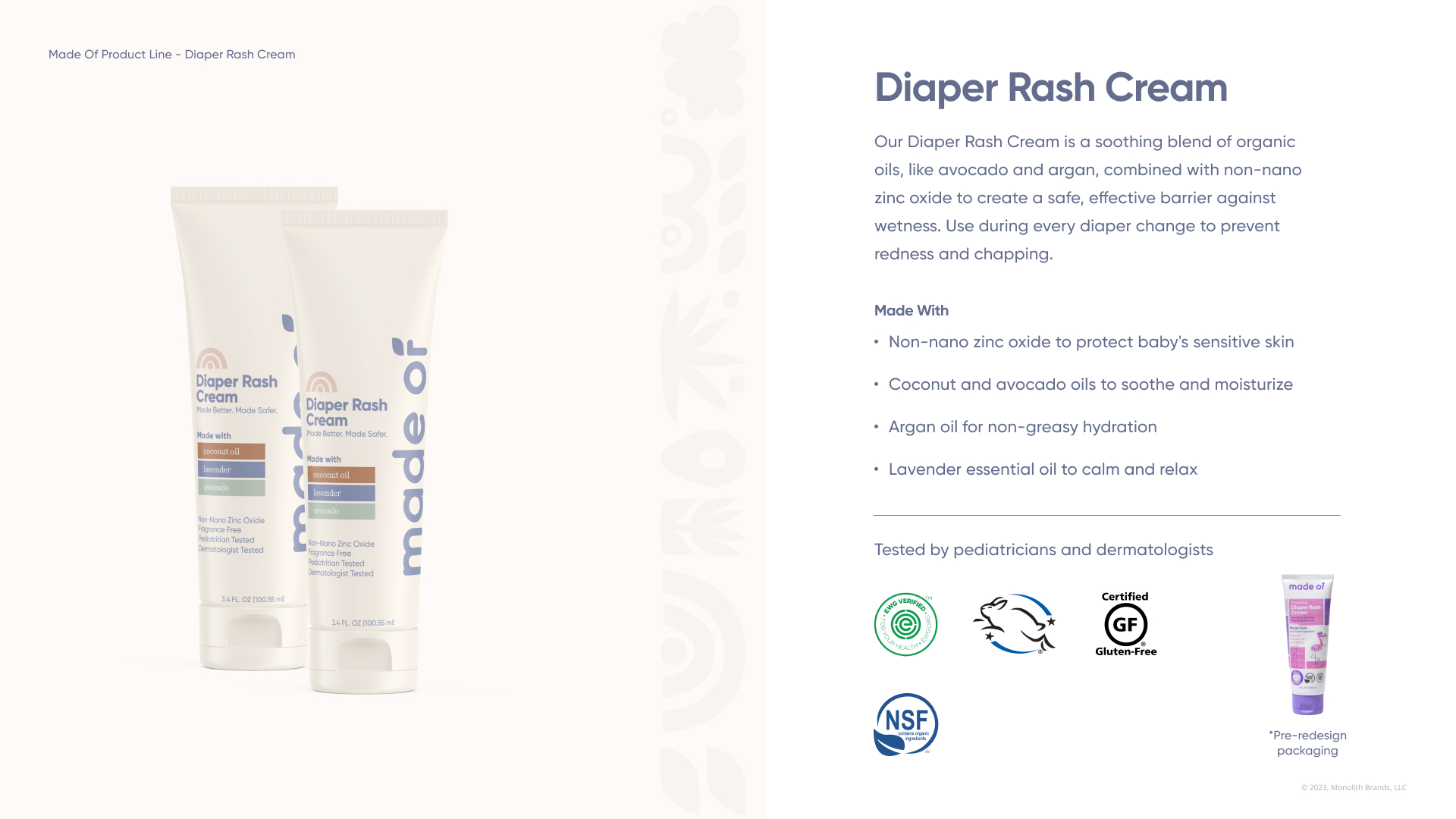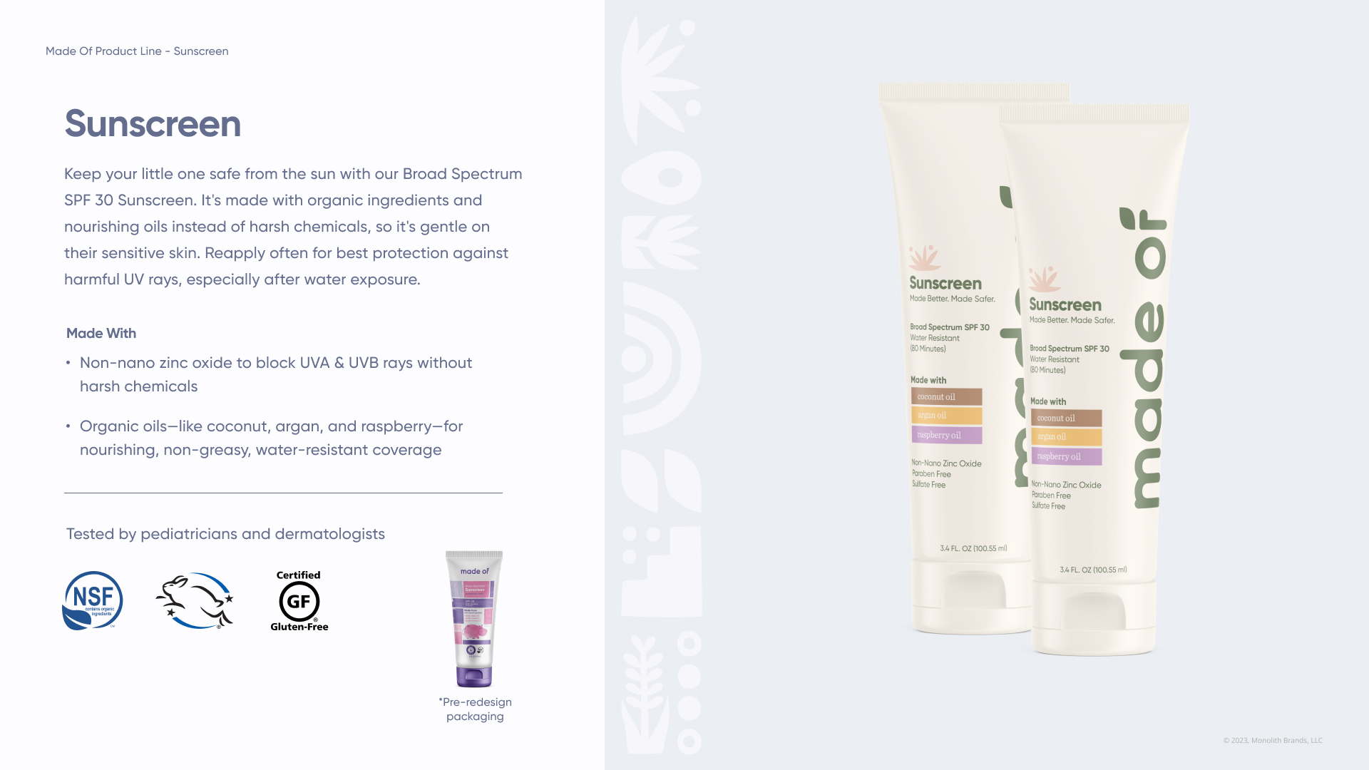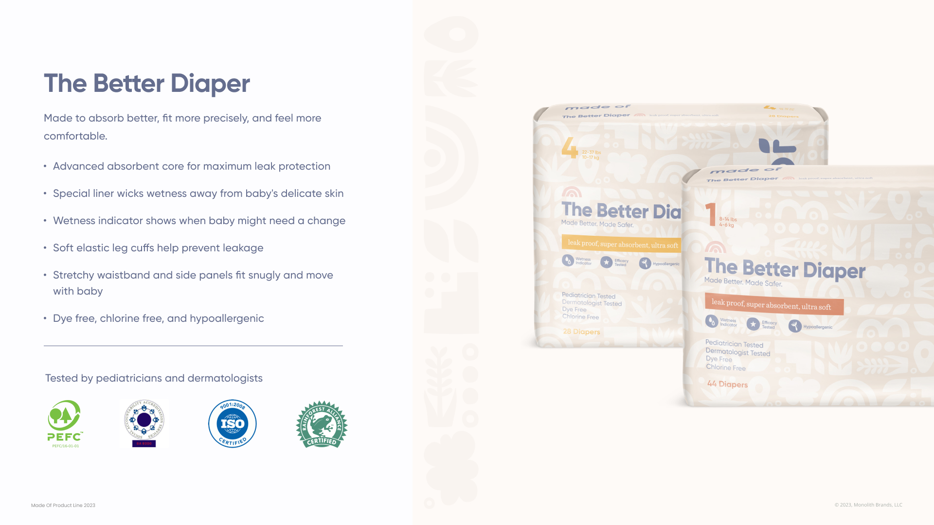 Made Of had something special: a genuine commitment to clean, organic ingredients and real transparency with the parents who trusted them. But the brand’s clinical tone and loud visual style told a story that was at odds with that quiet, honest ethos. There was a disconnect between what the brand truly stood for and how it was showing up in the world. We came in to close that gap, reimagining the brand voice and visual identity from the ground up. The result is a brand that finally sounds and looks like itself—warm, honest, and always centered on the well-being of little ones and the parents who love them fiercely.